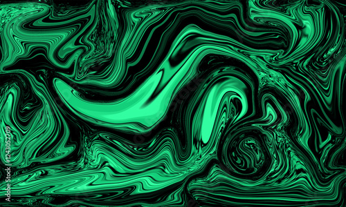 Abstract neon liquid marble pattern background. 3 colors backdrop, black, ufo green, and medium spring green. Suitable for creative projects and designs.