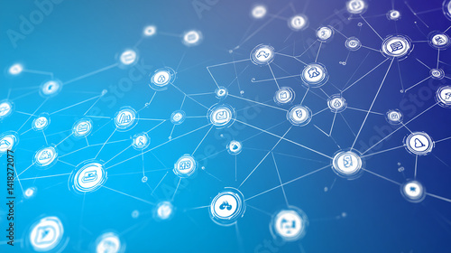 Abstract network graphic, blue gradient background, interconnected icons symbolizing global connection, digital communication, and data flow, ideal for technology or business concepts
