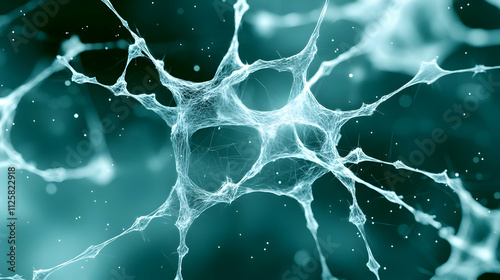 Abstract neural network 3D render with glowing connections and particles on a dark teal background, science and technology concept