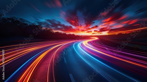 Abstract night road with vibrant light trails against a dramatic sunset sky.