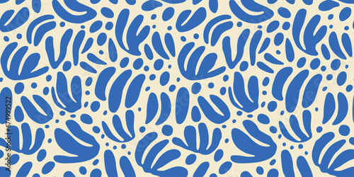 Abstract organic shape art seamless pattern with blue nature doodles. Contemporary flat cartoon background, simple leaf shapes in hand drawn style.