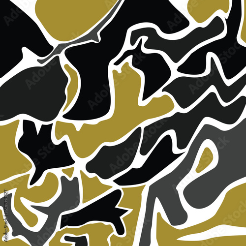 Abstract organic shapes in gold, black, and gray