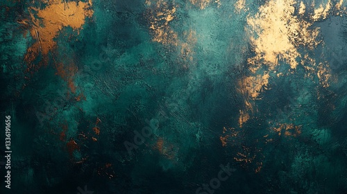 Abstract painted canvas with emerald green and gold colors