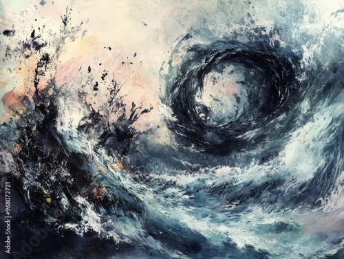 Abstract painting of a stormy sea with swirling vortex and crashing waves, evoking a sense of chaos and power in nature.