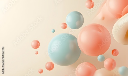 Abstract pastel spheres and balls floating gracefully against a soft beige background, Generative AI