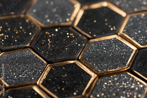 Abstract pattern of hexagonal tiles with gold edges and sparkling glitter texture
