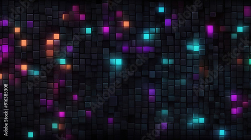 Abstract Pixel Art with Bright Neon Colors and Retro Grid Effects on a Dark Background, Featuring Ample Copy Space for Text or Branding