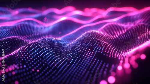 Abstract purple pink blue neon glowing particle wave background dots light.
