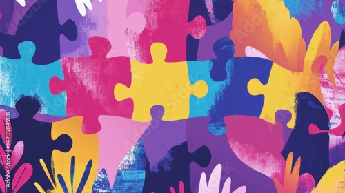 Abstract puzzle pieces in vibrant colors and textured background, featuring organic shapes and plant like elements.