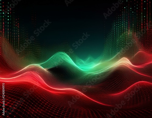 abstract red and green particle waves flowing in dark cyberspace creating dynamic and futuristic digital landscape background for design and illustration