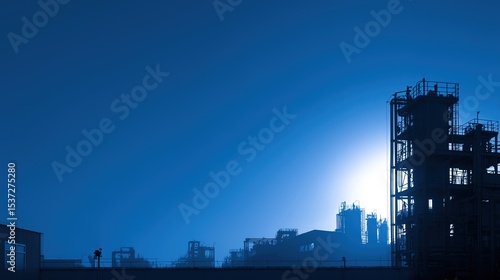 Abstract refinery silhouette with geometric shapes against gradient sky, symbolizing industrial innovation and modern energy production
