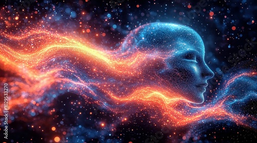 Abstract Representation of a Cosmic Face with Colorful Light Trails