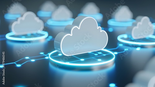 Abstract representation of cloud computing with illuminated network connections and floating cloud icons.