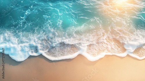 abstract sand beach from above with light blue transparent water wave and sun lights, summer vacation background concept banner with copy space, natural beauty spa outdoors