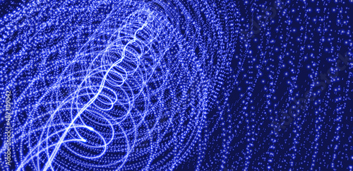 Abstract science or technology background. Array with dynamic particles. Swirl with connected dots and light effect. 3d grid surface. Vector illustration.