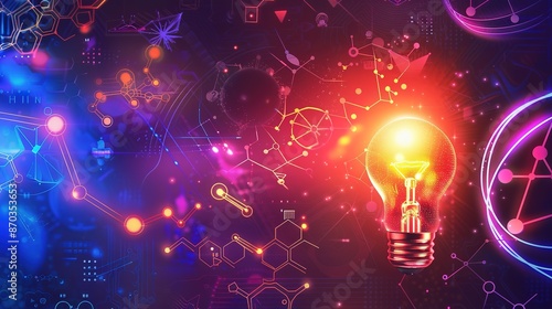 Abstract Scientific Background with Glowing Light Bulb and Iconic Elements in Vibrant Colors