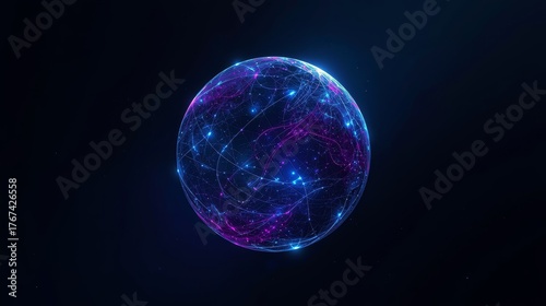 Abstract sphere of glowing particles and lines on a dark blue background