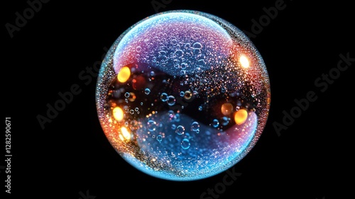 Abstract sphere with vibrant colors, bubbles, and glowing particles on a black background.