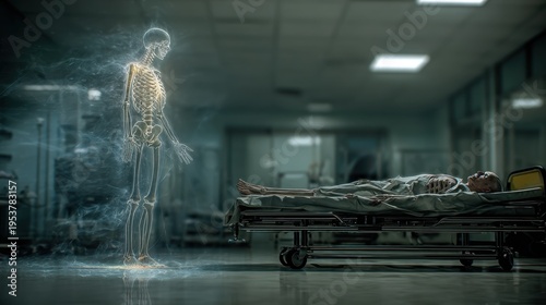 Abstract Spirit Leaving Body on Stretcher in Hospital Hallway Death Concept