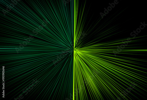 Abstract surface of radial blur zoom in dark and light green tones on a black background, creating a vibrant energetic burst with dynamic light rays.