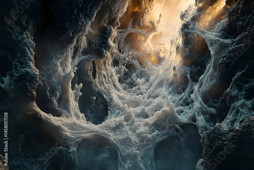 Abstract, swirling, cave-like, interior, illuminated passage.