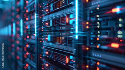 Abstract technology background of server room with many rack-mounted servers.