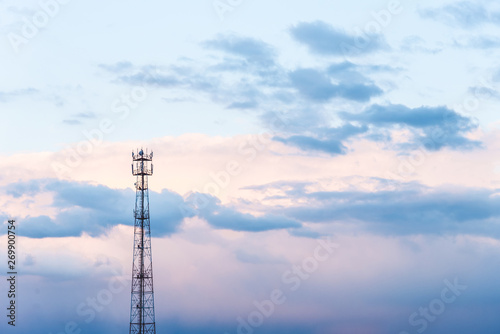 Abstract telecommunication tower Antenna and satellite dish at sunset sky clouds backgrounds.