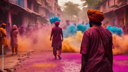 Abstract template on dust powder explosion Holi backdrop. Indian traditional Holiday, generative AI