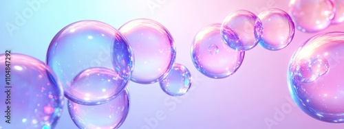 Abstract Transparent Bubbles in Pastel Pink and Blue Background with Iridescent Sparkling Effect