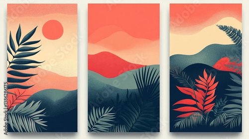 Abstract tropical landscape with sunset, plants and mountain ranges posters