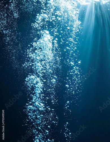 Abstract Turquoise Bubbles Rising in Deep Blue Water with Sunlight