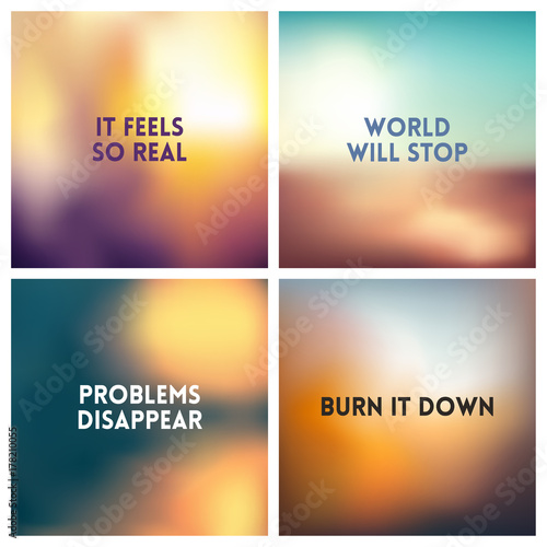 Abstract vector multicolored blurred background set. 4 colors set. Square blurred nature backgrounds set - sky clouds sea ocean beach colors With love quotes