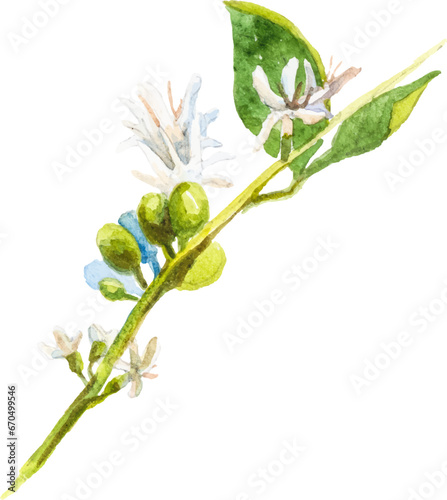 Abstract vector watercolor illustration of coffee tree flower. Hand drawn nature design elements isolated on white background.