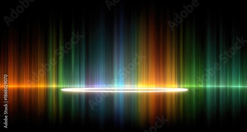 Abstract, vibrant, colorful vertical light beams, circular white platform