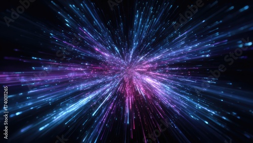 Abstract, vibrant explosion of light rays radiating outward from a central point in dark space