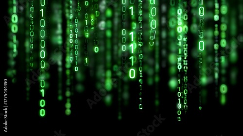 Abstract visualization of cascading green binary digits representing digital data and technology in a futuristic dark environment with glowing effects