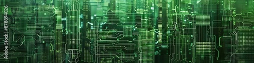 Abstract wallpaper style image featuring a green circuit board cityscape, perfect for a high-paying science and technology popular science publication background or bestseller, HD wallpaper, backgroun