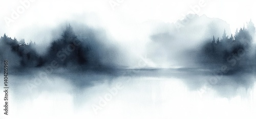 Abstract Watercolor Landscape of Forest with Misty Brushstrokes and Soft Monochrome Palette for Postcards and Posters