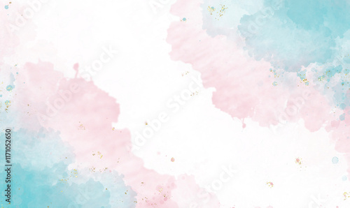 Abstract Watercolor Style illustration with Light Blue and pink Paint Stains on a White Background and golden splashes, design template for card ,wedding invitation or birthday