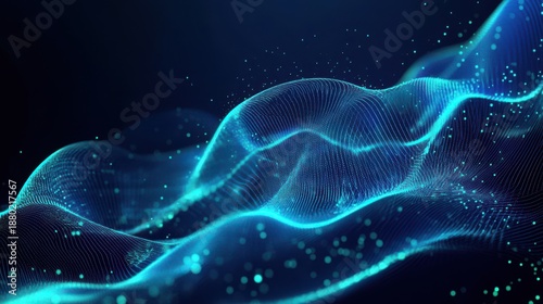 Abstract Waves of Light in Digital Space with Blue Neon Glow