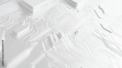 Abstract white circuit board texture, close-up view showing intricate pathways and components.