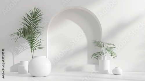 Abstract white round stand for product presentation on white background, empty room with shadows on podium, blurred background for product display