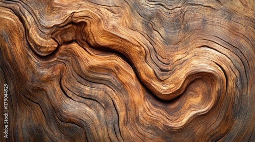 Abstract wood texture with swirling grain patterns, rich brown and dark tones.