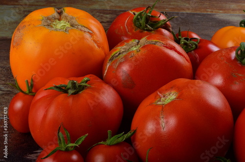 Abundance ripe organic tomatoes on dark rustic background. Colorful tomatoes