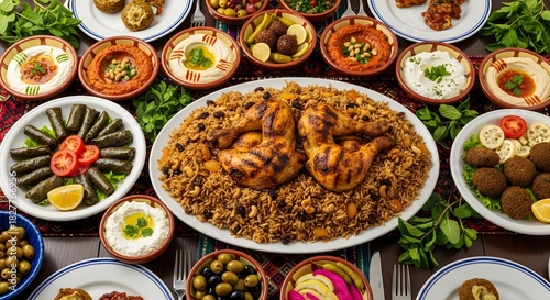 Abundant middle eastern feast with roasted chicken and various dishes