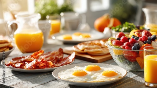 Abundant Sunny Morning Breakfast Spread with Fried Eggs, Crispy Bacon, Pancakes, and Fresh Fruit Salad.