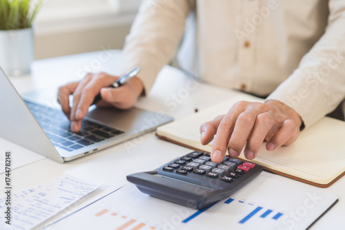 Account finance, asian young business man hand using calculator, laptop computer for calculate budget, cost and income of company from paperwork, plan spend money expenses, working on desk at home.