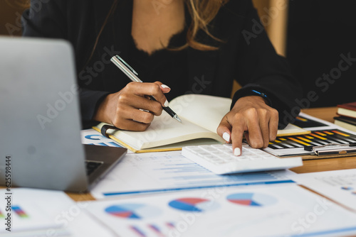 Accountant doing audit work using calculator and papers on office desk. Financial statement planning and accounting budget.
