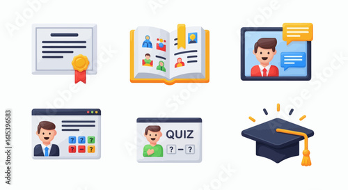 Achieve educational success with these modern online learning icons featuring certificates, quizzes, and graduation.