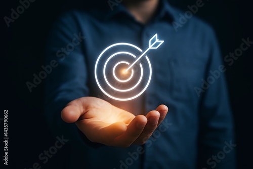 Achieving business goals and strategic targets with a hand presenting a digital target of success